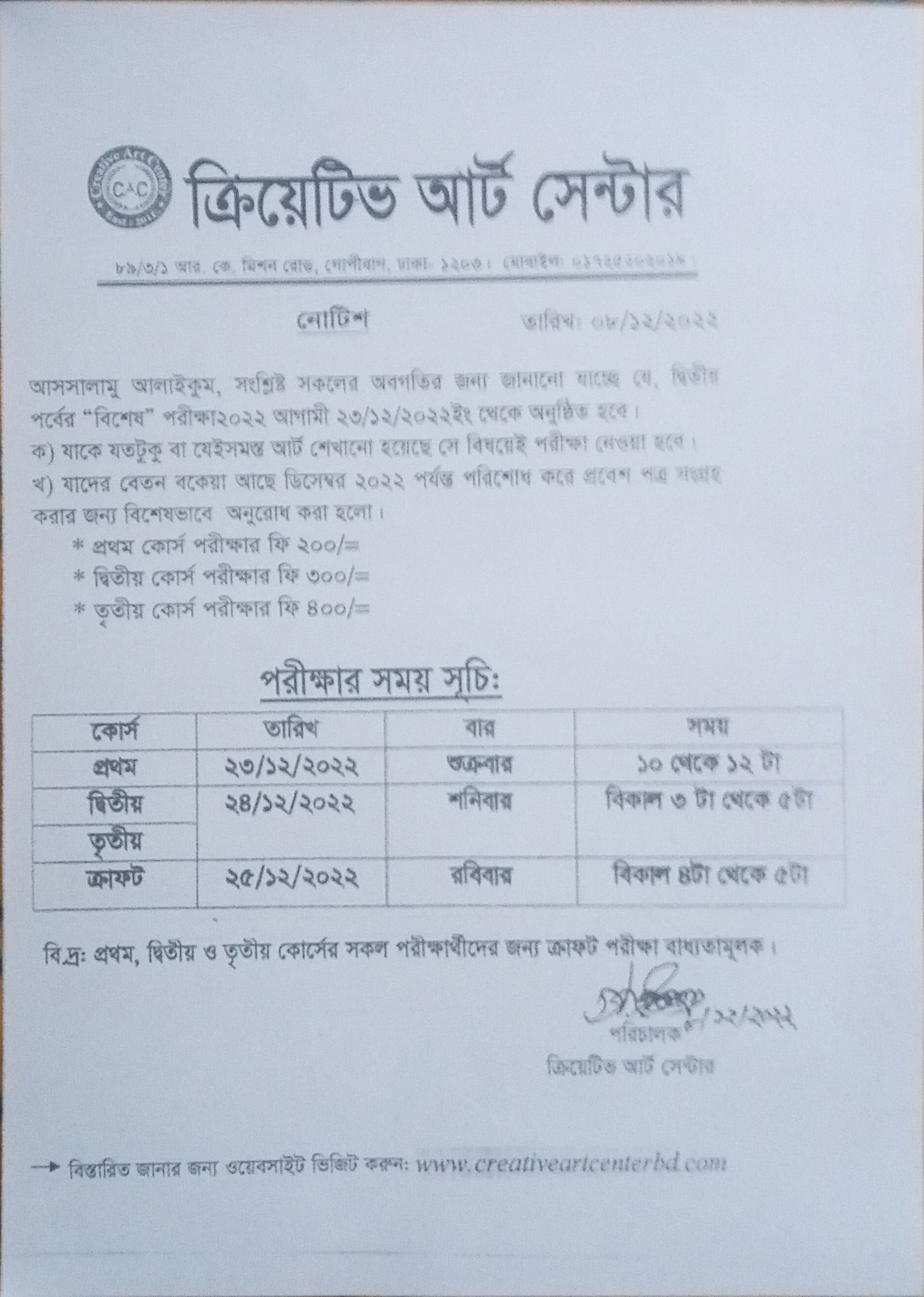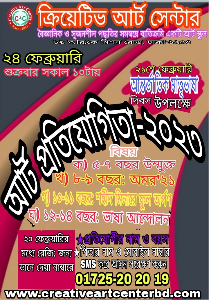 ক্রিয়েটিভ আর্ট সেন্টার সৃজনশীল পদ্ধতির সমন্বয়ে ব্যতিক্রমিক একটি আর্ট স্কুল পরিচালনায় ছাত্র-ছাত্রী মানসম্মত আর্টিস্ট হিসেবে গড়তে আমরা অঙ্গীকারবদ্ধ । বাস্তব, যুগোপযোগী ও গুণগত মানসম্পন্ন শিক্ষা প্রদানই এই প্রতিষ্ঠানের প্রধান লক্ষ্য। প্রকাশ থাকে যে, ক্রিয়েটিভ আর্ট সেন্টার তার ব্যাপক কর্মকান্ড বিশেষ করে জাতীয় ও আন্তর্জাতিক পর্যায়ে পুরুষ্কার -অর্জন করেছে ।